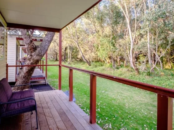 Each chalet features a separate queen bedroom and an open-plan living area with a kitchenette (cooktop only), while a sofa converts into a double bed for additional guests. A private ensuite, TV and reverse cycle air conditioning provide year-round comfort, with weekly servicing included for a carefree stay.